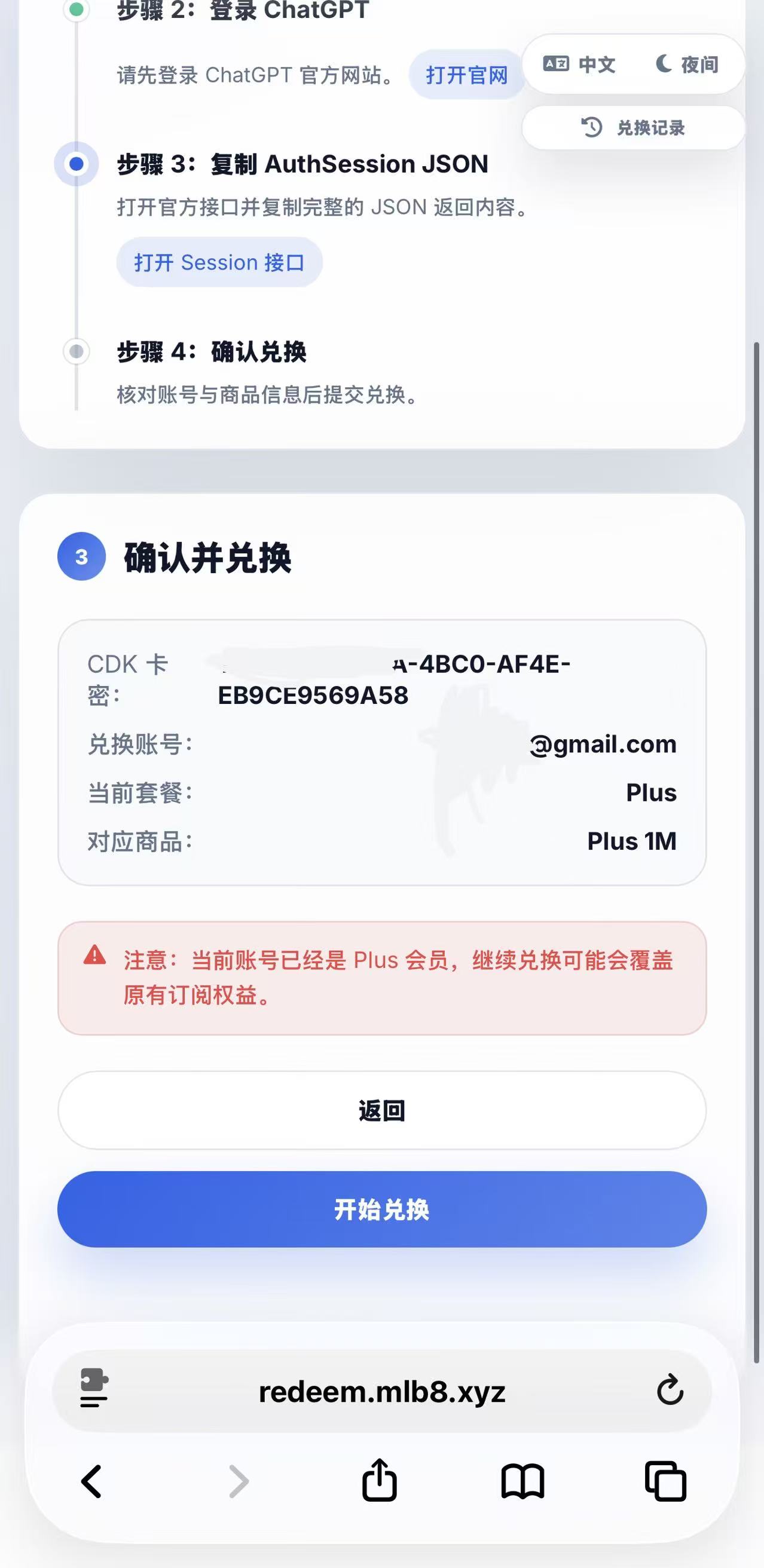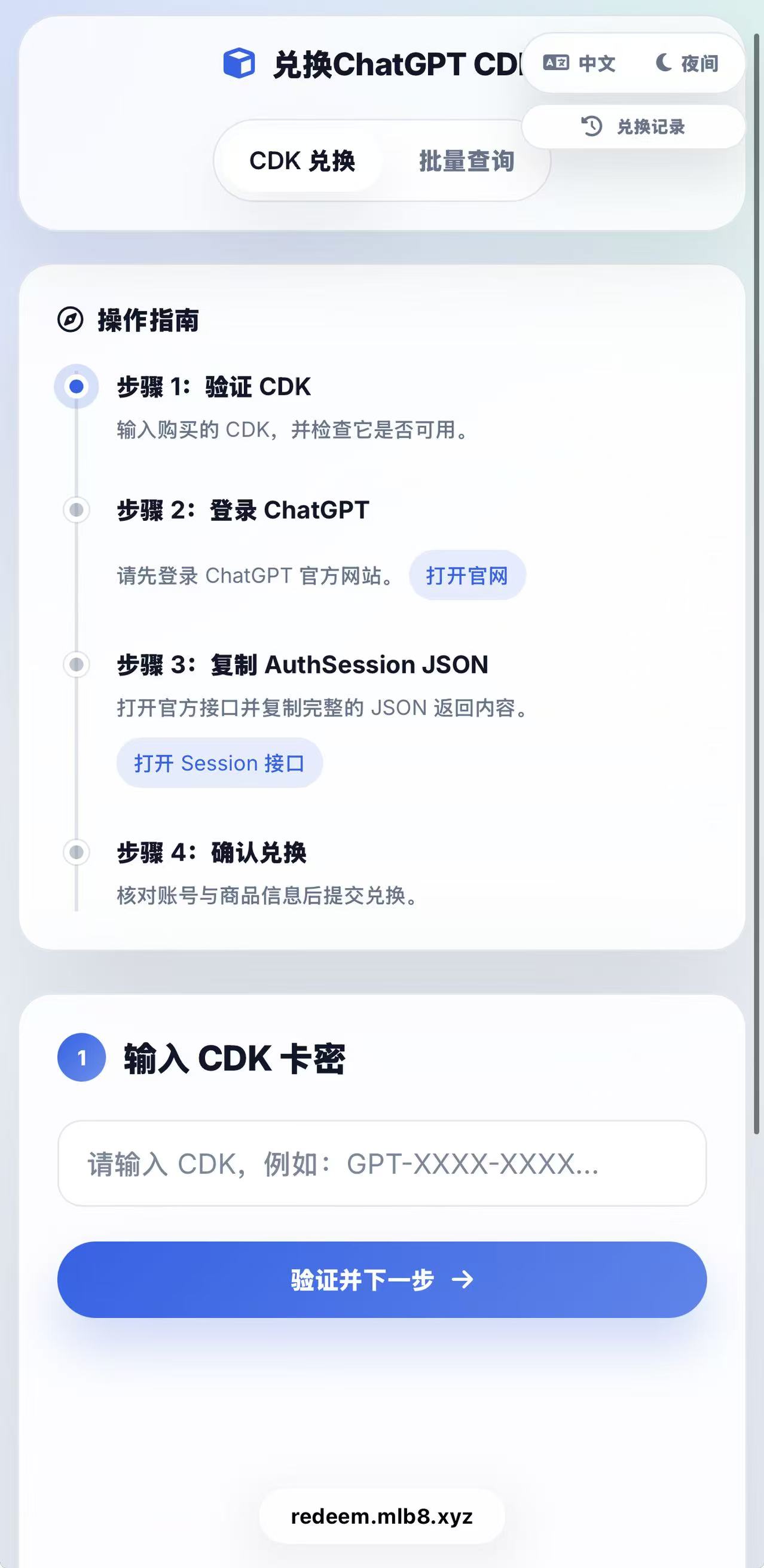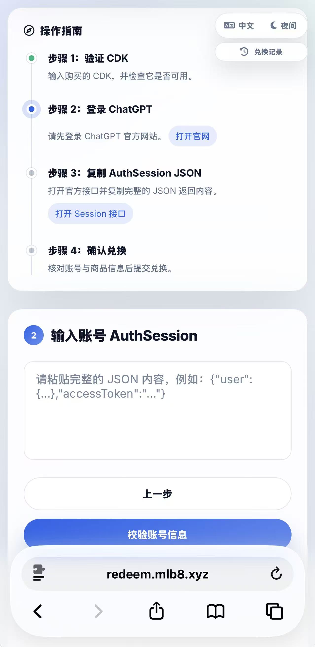 这份页面按手机浏览器的操作节奏重新整理过,适合在移动端完成卡密验证、登录 ChatGPT、复制 Session JSON 和确认兑换。